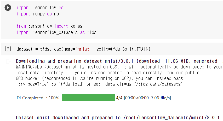 tensorflow_datasets์ด๋ผ๋ ๋ชจ๋์ importํ๊ณ name์์ mnist์์ ๋ช ์ํด์ฃผ๋ฉด ์๋์ ๊ฐ์ด ์์ฃผ ๊น๋ํ๊ฒ ์คํ๋๋ค.