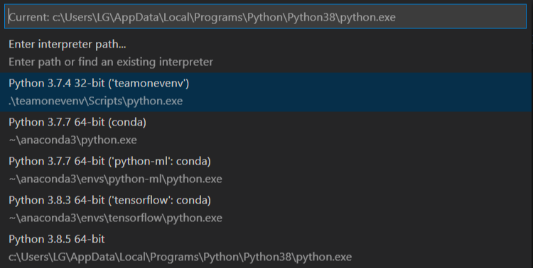 ๋ด ์ปดํจํฐ์๋ conda๋ ์ค์น๋ผ์์ด์ ๊ฐ์ด ๋ด๋๋ฐ ๋ค๋ฅธ ํ๋ก๊ทธ๋จ์ด ์ ๊น๋ ค ์์ผ๋ฉด ๋งจ ๋ง์ง๋ง์ฒ๋ผ ๋ฑ python๋ง ๋ฌ๋ค. ์๋ ์์ฑ์ผ๋ก ๋ชฉ๋ก์ด ์ ๋ฌ๋ค๋ฉด Enter interpreter path๋ฅผ ๋๋ฌ์ python.exe๊ฐ ์๋ ํด๋์์ ์ง์ ์ง์ ํด์ฃผ๋ฉด ๋๋ค.